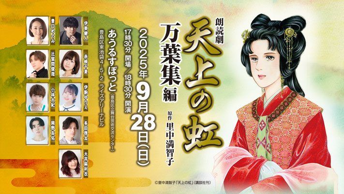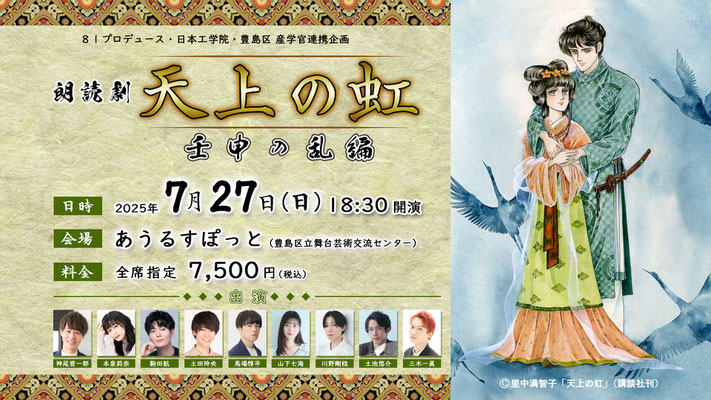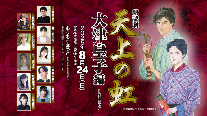飛鳥時代に活躍した女帝・持統天皇の生涯を描いた里中満智子原作『天上の虹』が初の朗読劇化!中大兄皇子(後の天智天皇)の娘として生まれ、大海人皇子(後の天武天皇)に嫁いだ鵜野讃良皇女。後に天皇となる彼女の波瀾万丈な人生を、壮大なスケールで描いた歴史ロマン作『天上の虹』を81プロデュースの豪華声優陣が三部作でお届けします。